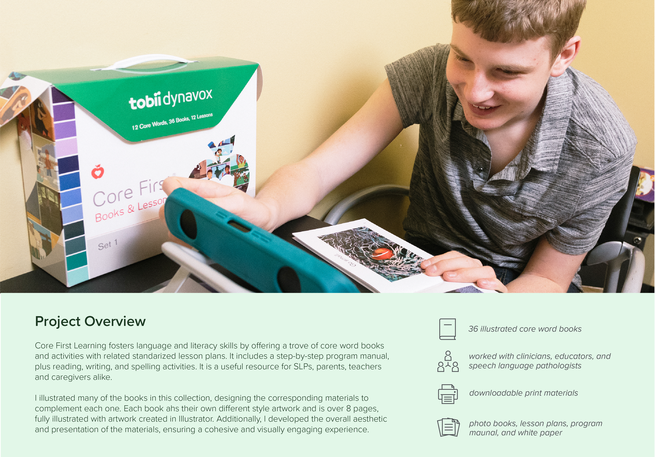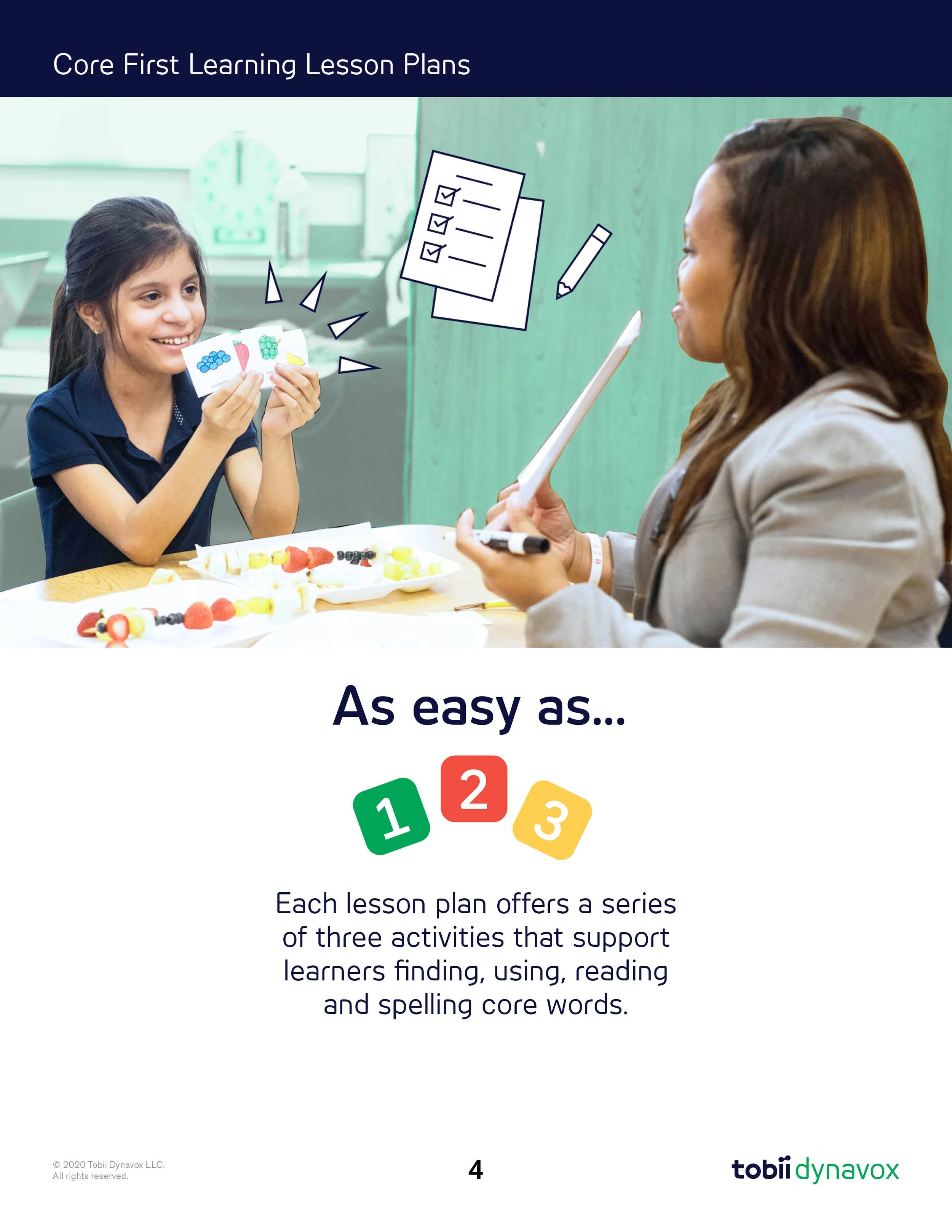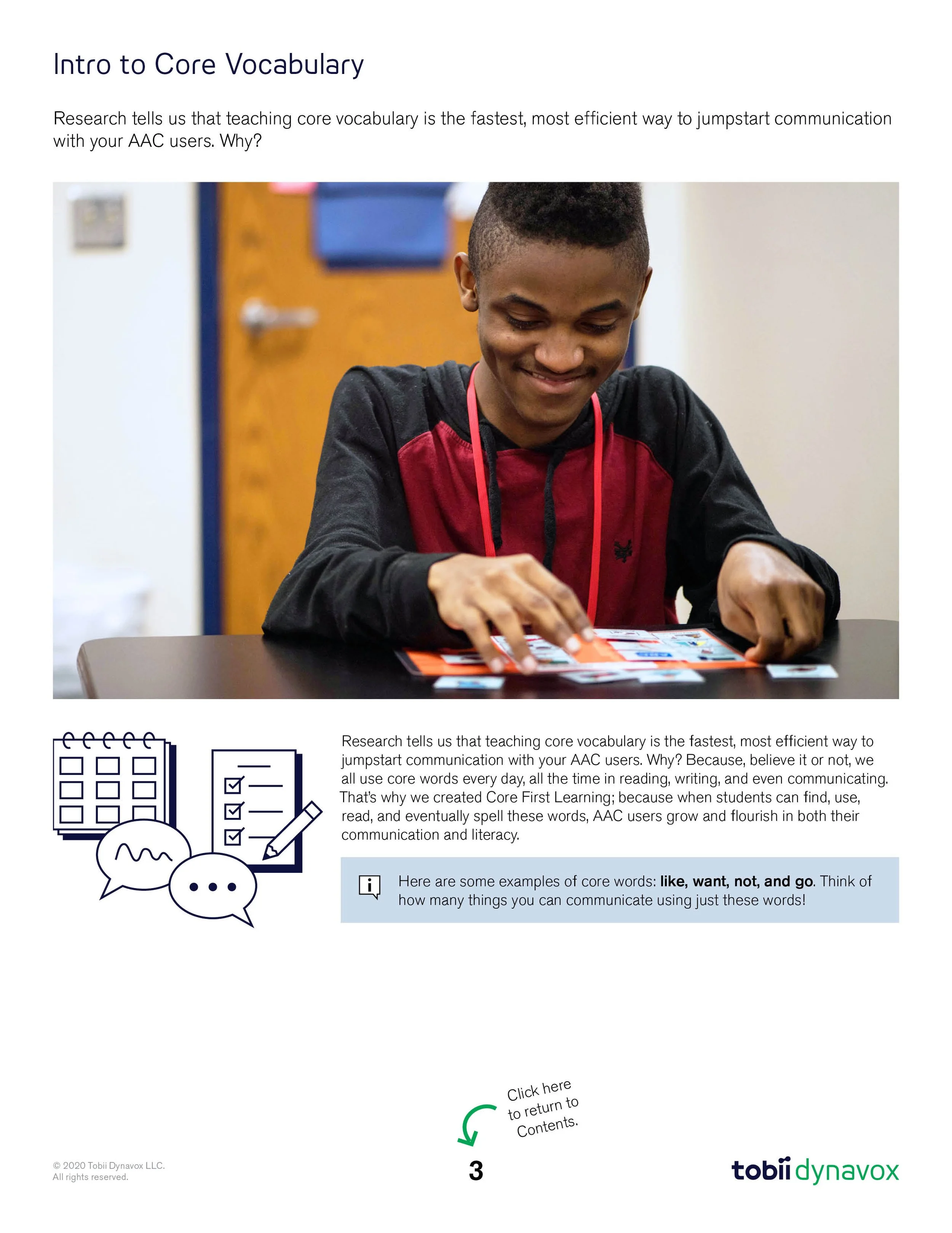 The Core First Learning Quick Lesson Guide offers a concise, easy-to-follow version of the detailed lesson plans that correspond to each Core Word and activity. It serves as a practical tool for implementing the Core First curriculum. For this guide, we incorporated custom-designed icons, illustrations, photos, and typography to enhance clarity and engagement.