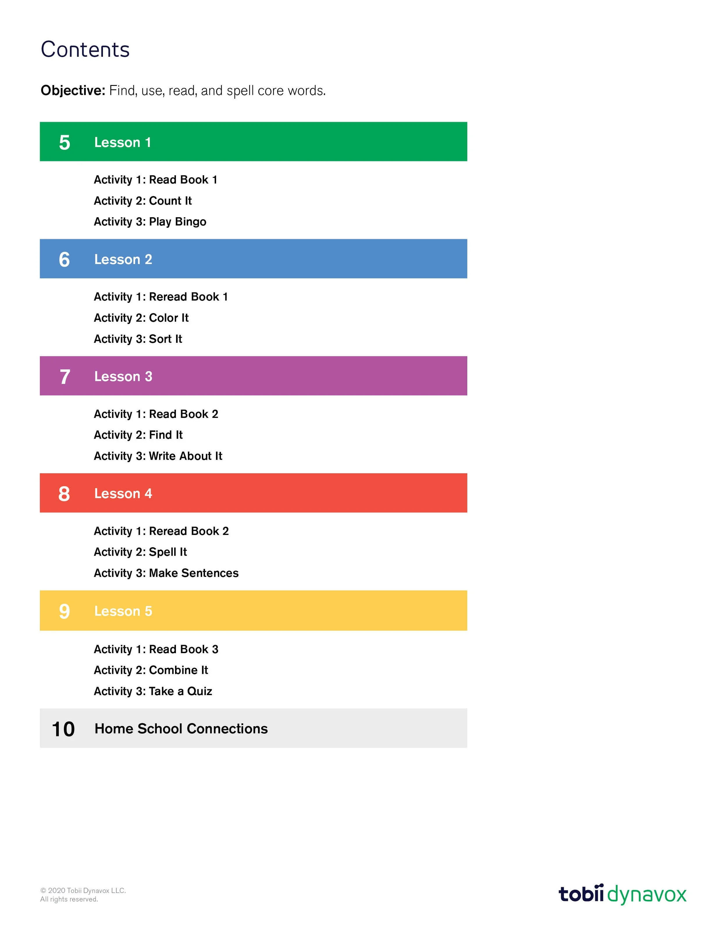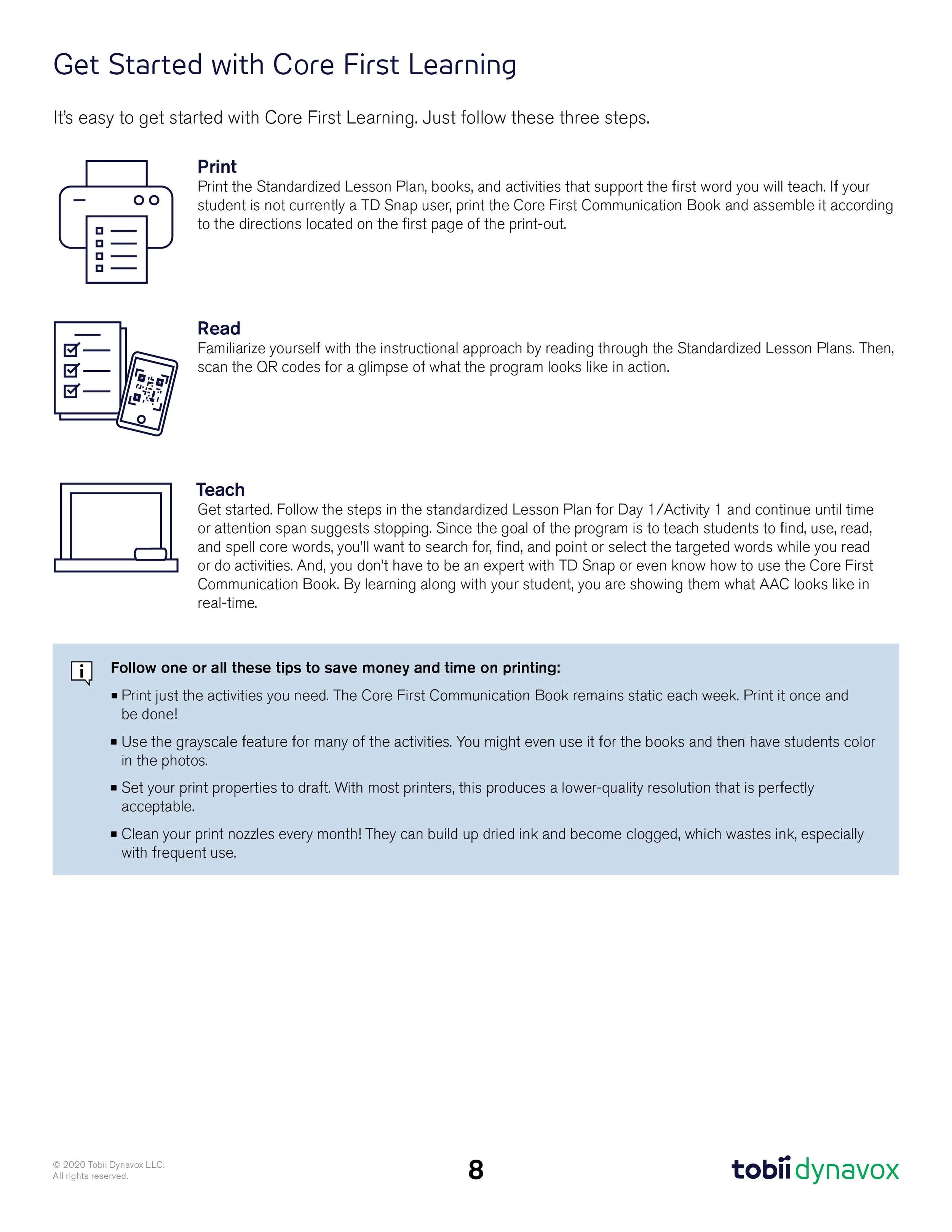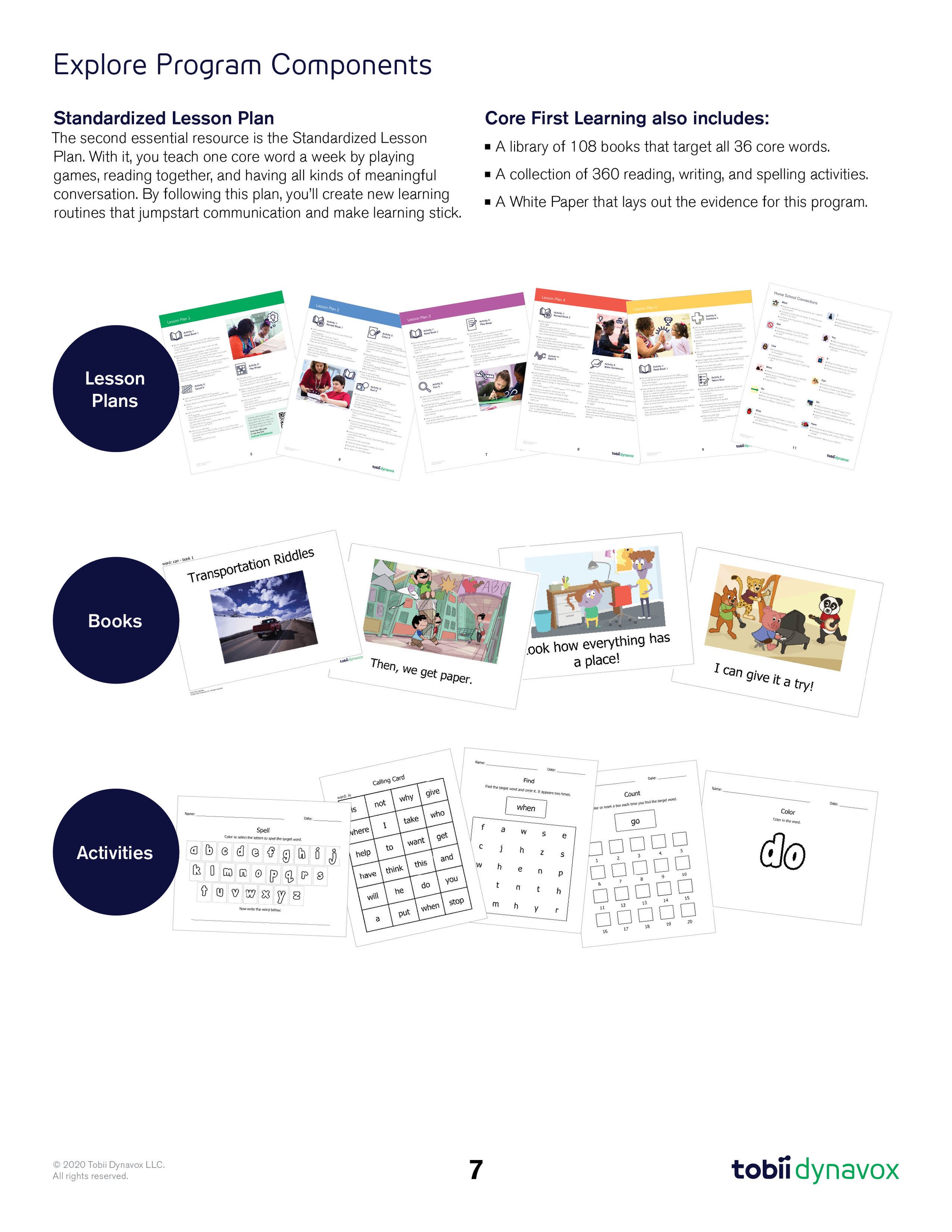 The Core First Learning Quick Lesson Guide offers a concise, easy-to-follow version of the detailed lesson plans that correspond to each Core Word and activity. It serves as a practical tool for implementing the Core First curriculum. For this guide, we incorporated custom-designed icons, illustrations, photos, and typography to enhance clarity and engagement.